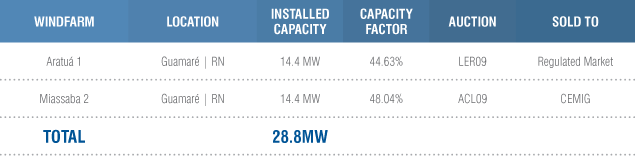 Miassaba 2, the first wind farm commercialized on the open market (Mercado Livre) with CEMIG, and Aratuá 1, hired in the regulated environment of the Energy Reserve Auction. They are the first two wind farms owned by Bioenergy.
